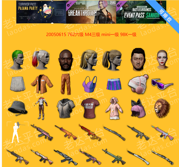 - 762六级 M4三级 mini一级 98K一级 小丑男头 小丑女头 黑鬼 双马尾 女团头 渔夫帽 滑雪套 监狱服 炫彩套 JK上衣 红大 兔子上衣 500生存 小白裙