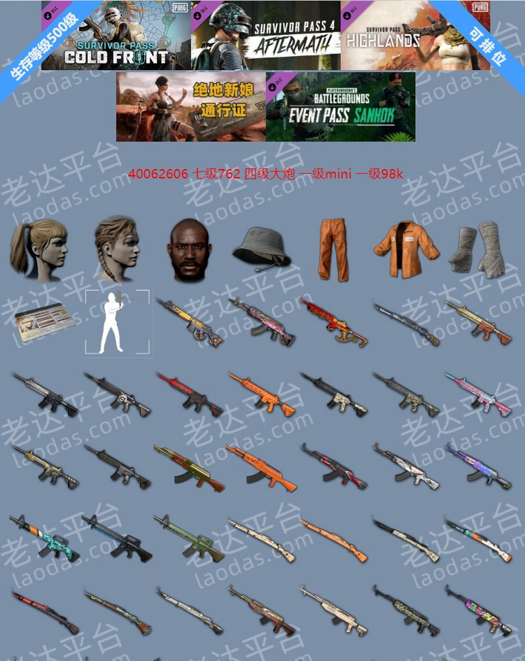 - 七级762 四级大炮 一级mini 一级98k 双马尾 黑鬼 渔夫帽 监狱服 绷带手套 500生存 五期满通