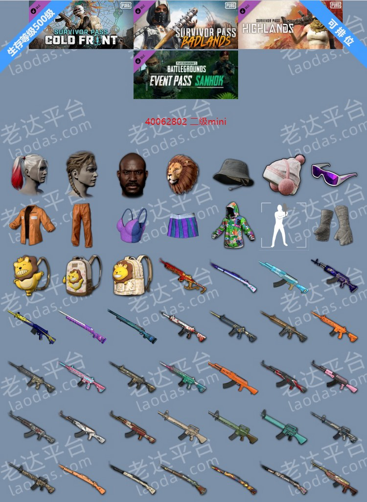 - 二级mini 小丑女 黑鬼 渔夫帽 滑雪套 监狱服 炫彩套 500生存 绷带手套 少女98k 玩具ak 湮灭762 玩具大炮 炫彩m24 四期满通
