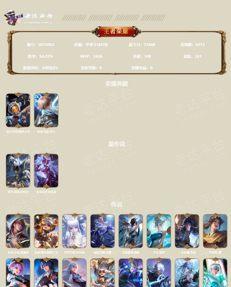 - iOSQ区 贵族v8 241皮 ➕LOL+和平精英 【内 测】:优雅恋人, 【荣耀典藏】:鸣剑曳影,星空梦想, 【星元传说皮肤】:零号雷霆,未来机甲, 【优质限定皮肤】:神威,白虎志,凤求凰,时雨天司,太华,至尊宝,冰封战神,祈雪灵祝,寅虎赤拳,寅虎瑞焰,大圣娶亲,零号赤焰,李逍遥,朱雀志,御风骁将,寅虎御盾,寅虎展翼,寅虎心曲,默契交锋(陵),逐梦之影,逐梦之翼,逐梦之星,霸王别姬(虞),霸王别姬(项),青春决赛季,冰霜恋舞曲,蜜橘之夏,天狼征服者,飞衡,默契交锋(花),白晶晶,孙行者,猪悟能,奇迹圣诞,狮舞东方,驯魔猎人,银河之约,迷踪丽影,暗影游猎,狂想玩偶猫,云间偶戏, 【优质皮肤】:高山流水,李小龙,梁祝,特工魅影,冰冠公主,偶像歌手,职业王牌,星空之诺, 【传说皮肤】:一念神魔,云霓雀翎,炽阳神光,云鹰飞将,猫影幻舞,音你心动(瑜),音你心动(乔),飞鸢探春,绛天战甲,黄金狮子座,末日机甲(香),超时空战士,电玩小子,龙骑士, 【其他皮肤】:天才门将,金属风暴,地狱岩魂,修罗,魅语,晚萤,猫狗日记(策),缤纷独角兽,黄金分割率,水晶猎龙者,曙光守护者,女仆咖啡,逐浪之夏,千年之狐,幽灵船长,乘风破浪,鬼剑武藏,圣诞恋歌,心灵战警,心灵骇客