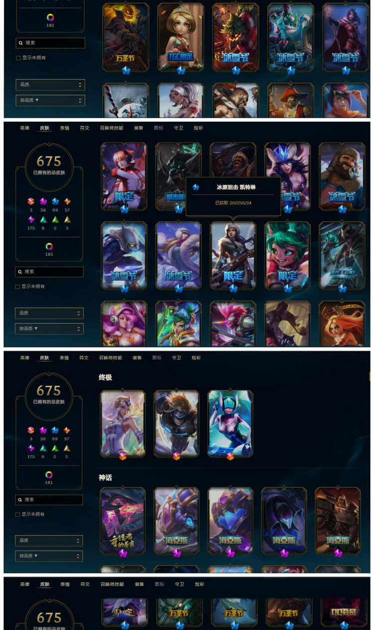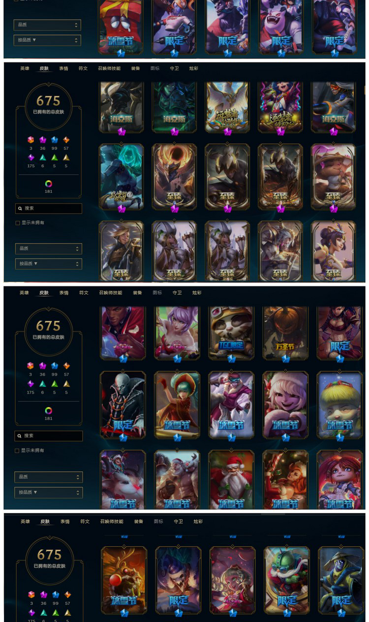 - 比尔吉沃特 675个皮肤 181个炫彩 蓝龙瞎 至臻20个